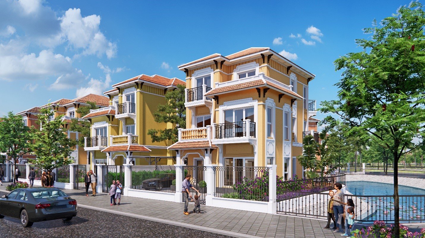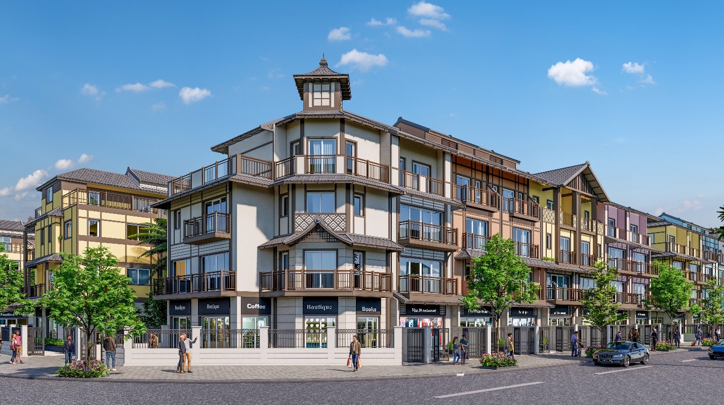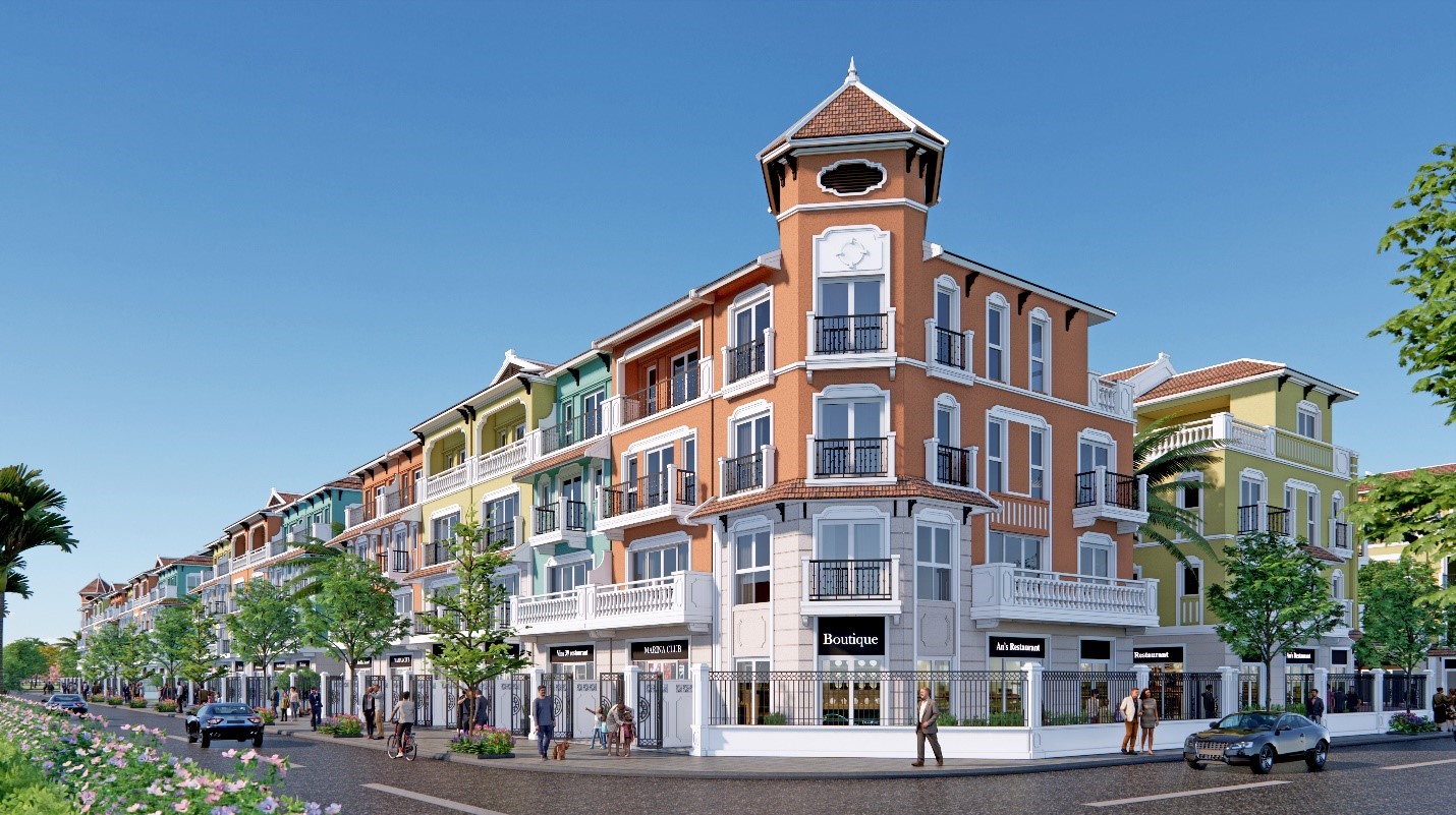 Những căn biệt thự liền kề, shophouse Pháp tại phân khu Ánh Sáng và Ánh Dương mang ngôn ngữ kiến trúc tân cổ điển sang trọng và tinh tế, với những chi tiết cửa vòm thanh mảnh trang nhã cùng hệ mái Mansard đặc trưng. Nơi đây tương lai sẽ hình thành những khu phố mua sắm tấp nập không kém nơi trời Âu hoa lệ.